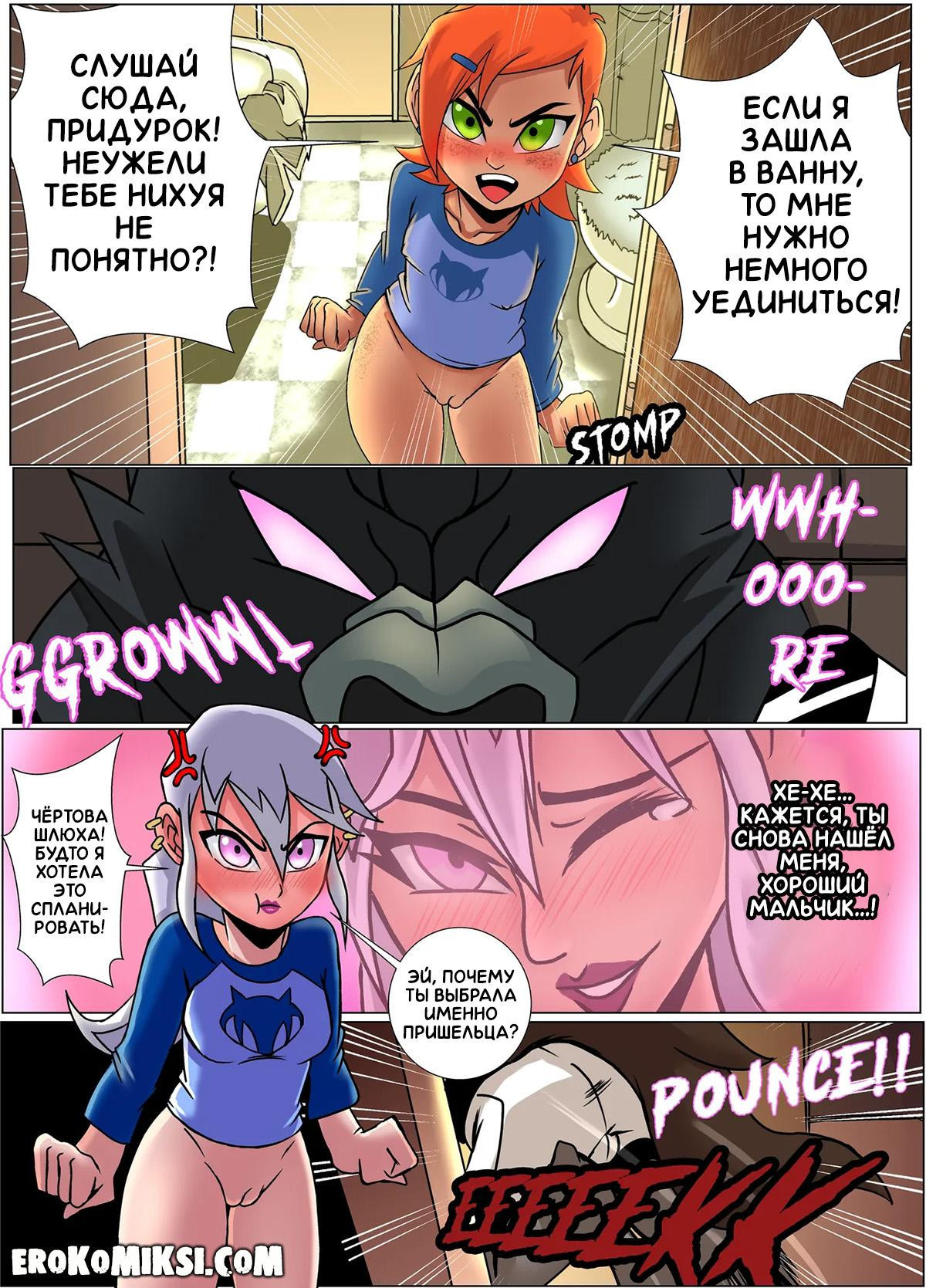 Порно комикс Бен 10. Желания Гвен. Гвен была не очень довольна своей маленькой задницей и попросила у заклинателя увеличить её, однако, заклинатель начал убеждать её, что она и так прекрасна и показал ей, что у него и так встаёт на неё член. При виде огромного члена заклинателя, Гвен сильно возбуждается и начинает играть со своей влажной киской…