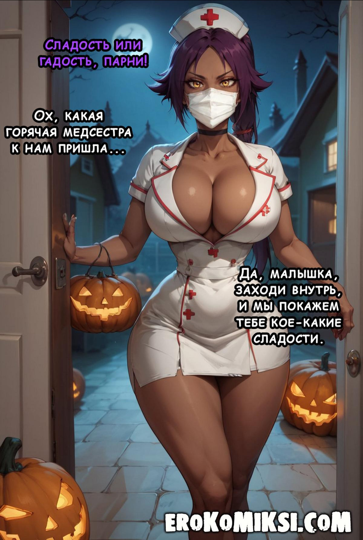 Порно комикс Блич. Хэллоуинский спэшл — Йоруичи. Йоруичи решила отпраздновать Хэллоуин и нарядилась в костюм горячей медсестрички. Она зашла в первый попавшийся дом, где встретилась с двумя парнями и решила отпраздновать вместе с ними…