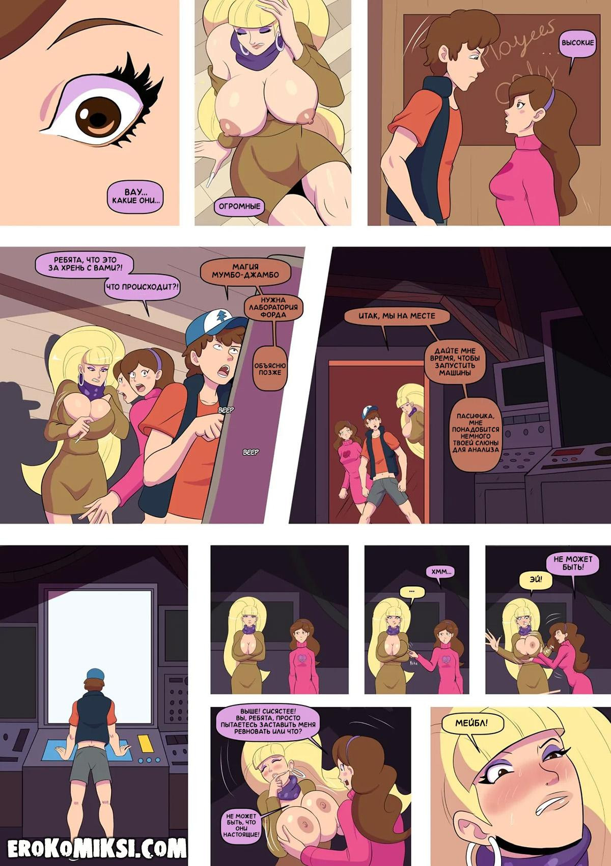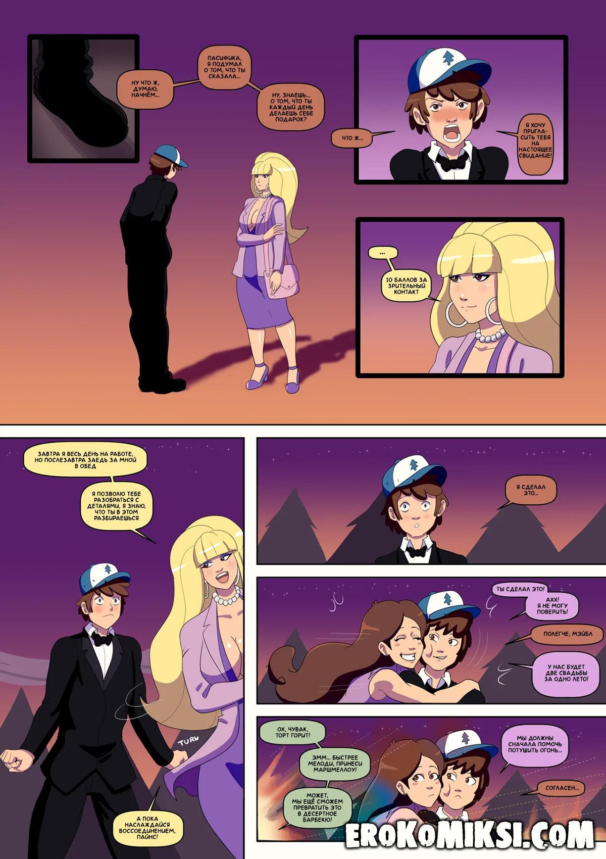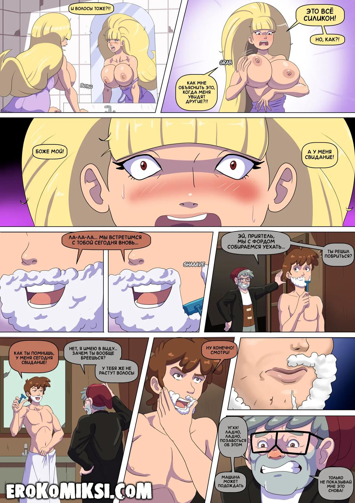 Порно комикс Гравити Фолз. Бимбо Фолз. Спустя много лет, Диппер и Мэйбл приезжают в Гравити Фолз на свадьбу Суса. Там Диппер встречает Пасифику, которая увеличила грудь, и приглашает её на свидание. Ночью, с Пасификой случаются метаморфозы и её грудь значительно увеличивается в размерах, она показывает свои изменения Дипперу, у которого сразу же встаёт член при виде огромных сисек…