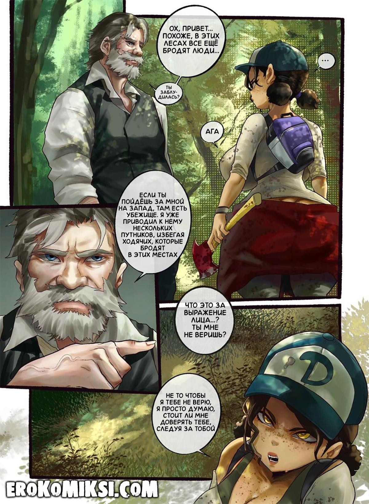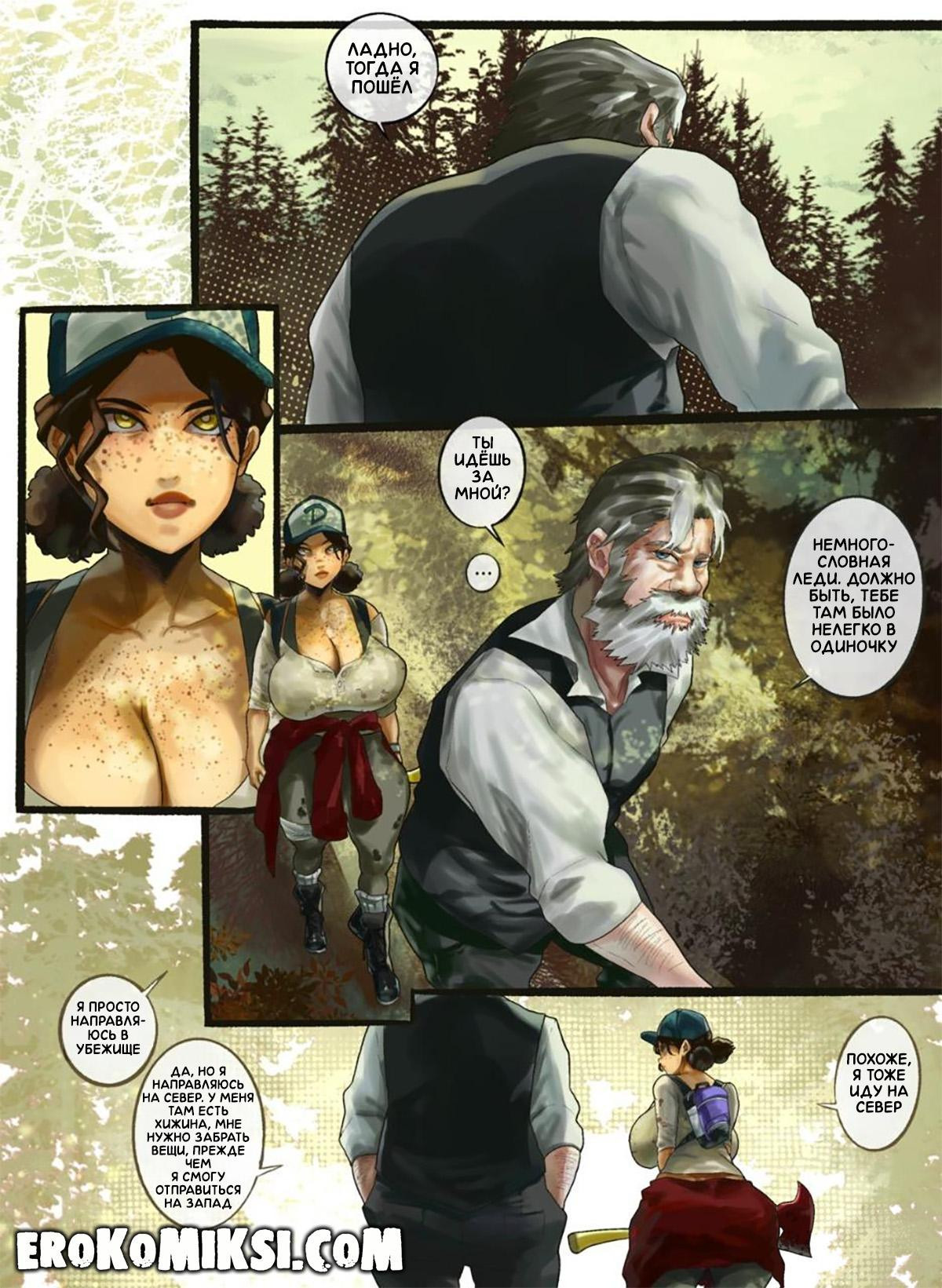 Порно комикс Ходячие Мертвецы. Не доверяй незнакомцам. Клементина скиталась в одиночестве по лесу и наткнулась на старика, который направлялся в свою хижину, и она решила последовать за ним. Девушка не знала, что нельзя верить первому встречному и стала его сексуальной рабыней, ведь старик долго не трахался и теперь, целыми днями напролёт развлекается с сисястой красоткой…