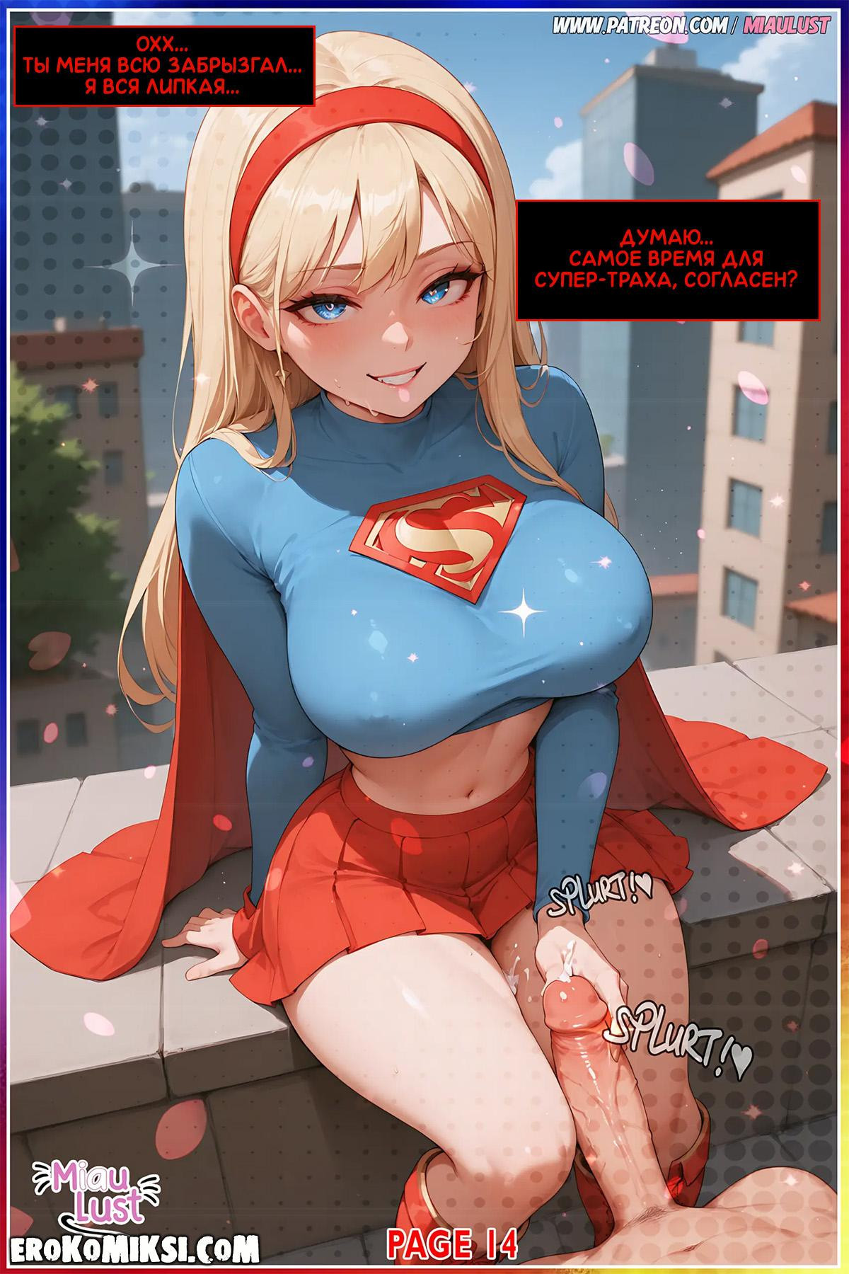 Порно комикс Супер-девушка. Спасение мира. Супер-девушка ловит преступника, который ограбил банк. Но неожиданно, она начинает возбуждаться и решает для начала немного поразвлечься с пареньком, и принимается дрочить его член…