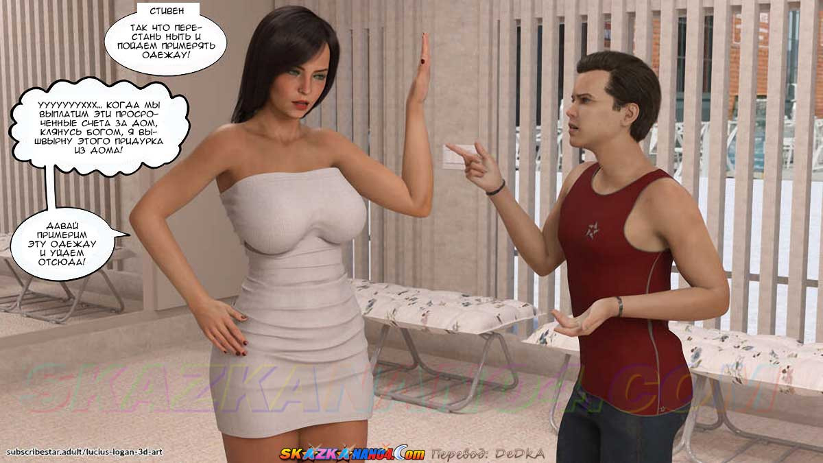 Порно комикс Удовольствие и деньги. Часть 2. Стивен ведет Стефани в магазин одежды, чтобы купить ей наряды, подходящие для съемок контента для взрослых, который уже приносит неплохие доходы. В магазине оказывается довольно много такой одежды, которая подошла бы для подобных съемок, но все же не купишь, поэтому Стивену приходит в голову мысль о том, что можно снимать Стефани в разных наряда прямо в примерочной кабинке, а не покупать их все для домашних съемок…