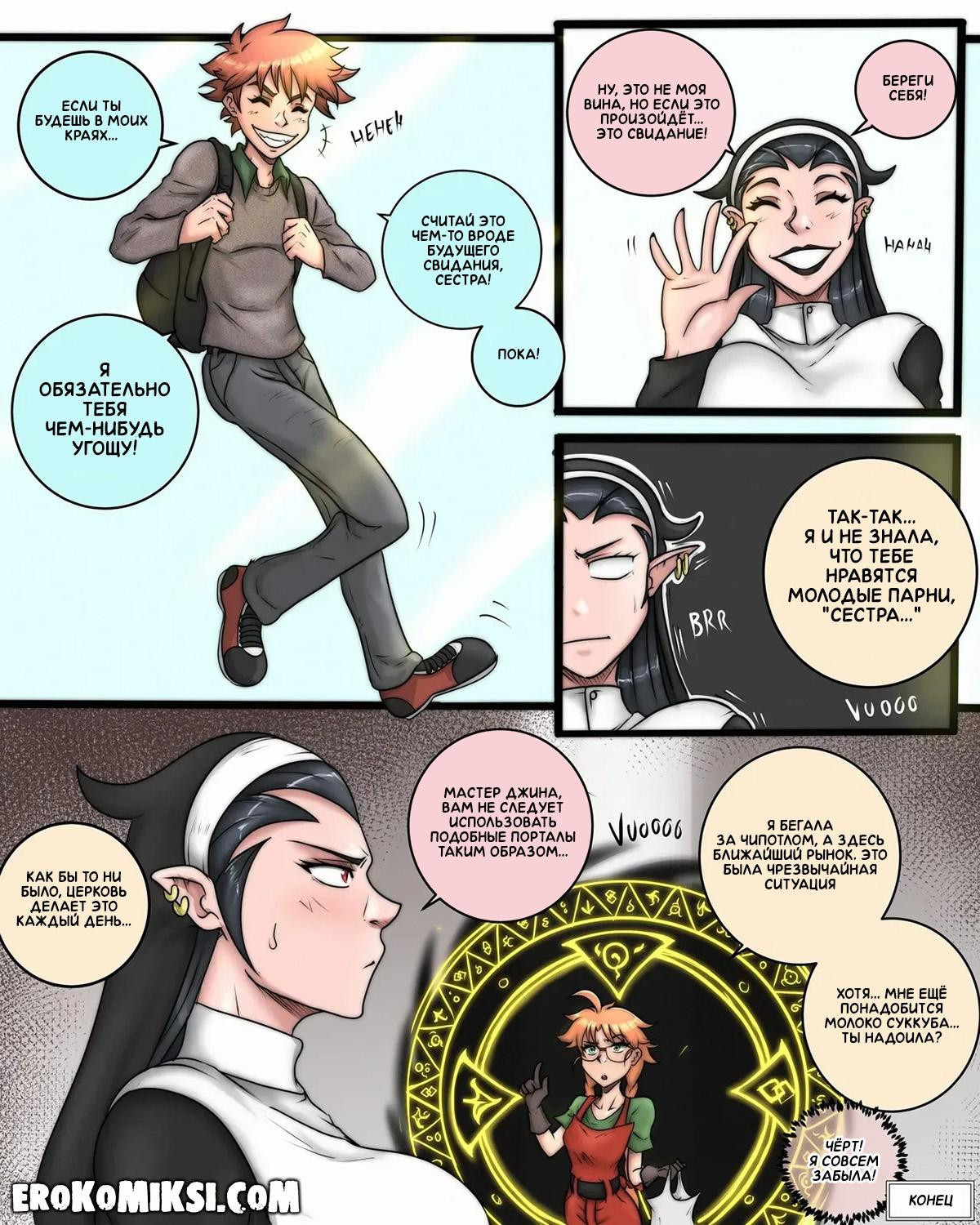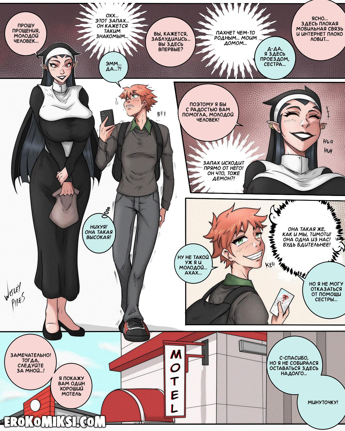 Порно комикс Встреча с Тимом. Монахиня-дьяволица встречает паренька Тима, от которого исходит странный знакомый запах, и она решает его проверить, и отводит в мотель, где снимает с паренька штаны и видя его огромный член, набрасывается на него…