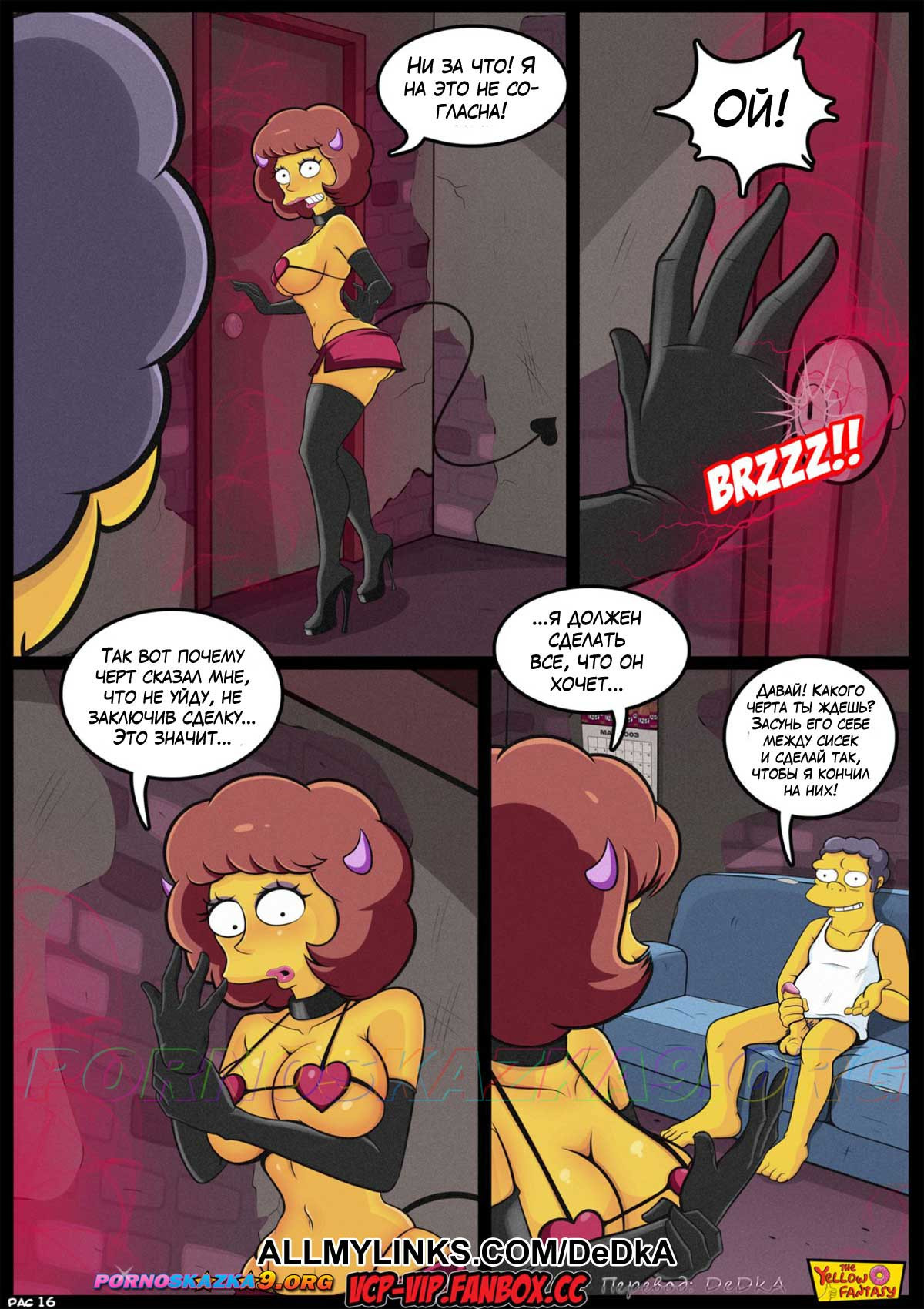 Порно комикс Желтая Фантазия. Список. Симпсоны. Неизвестно как, но Милхаус развел Мардж Симпсон на минет. Он обещал ей никому об этом не рассказывать, но сразу после того, как Милхаус кончил ей в рот, он сразу же побежал хвастаться своим успехом. Побежал, да не добежал — попал под машину…